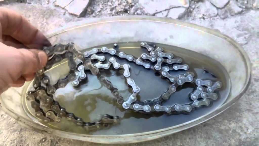 Для более тщательной чистки нам придется снять цепь с велосипеда. В зависимости есть ли на ней замок или нет, дополнительно нам может понадобиться выжимка. После того как мы ее демонтировали, помещаем в емкость с чистящим средством (варианты были рассмотрены выше) и при помощи щеток, тряпок продолжаем мыть до полной чистоты.