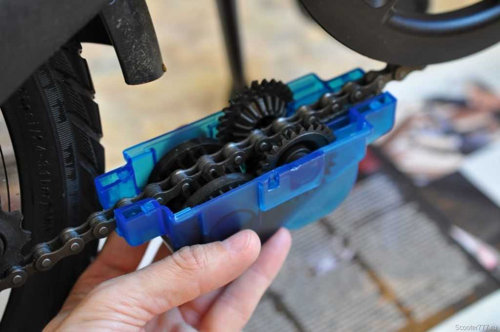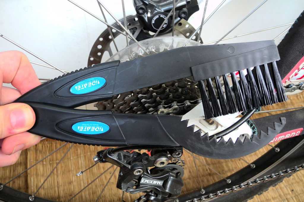 Эта процедура выполняется как промежуточная между капитальными обслуживаниями и представляет собой удаление грязи с цепи без ее демонтажа. Для этого можно воспользоваться двумя методиками: это по старинке, с тряпкой и щеткой, или прикупить себе специальную машинку для чистки велосипедной цепи. Тут уж все зависит от вашего бюджета.