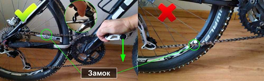 Если используете замок, то соедините им концы цепи и чтобы он защёлкнулся, нужно нажать задний тормоз и надавить на педаль. Замок при этом должен быть на участке цепи между кассетой и системой.