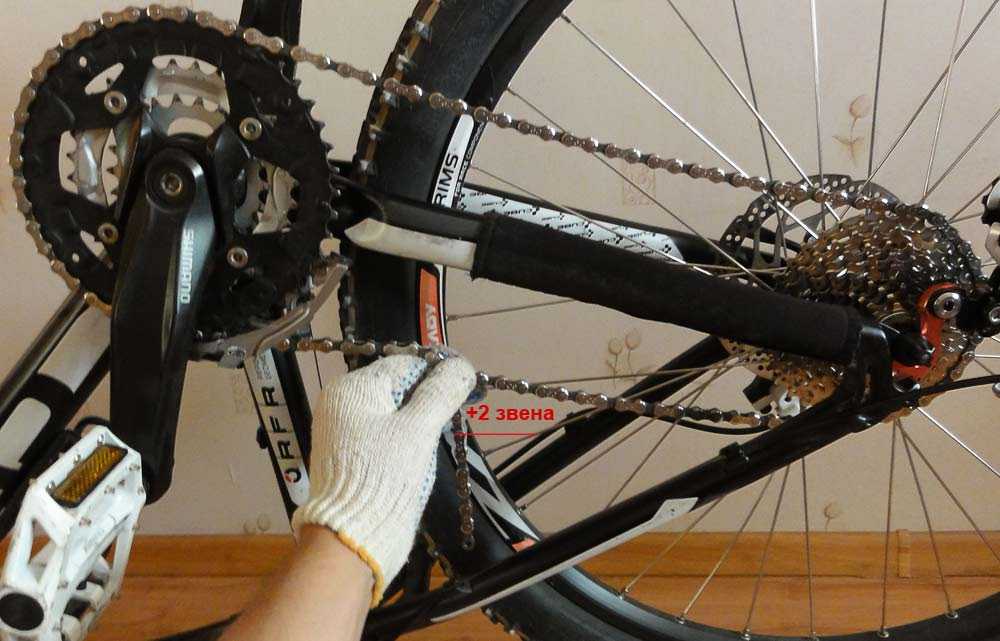 На хардтейлах (велосипеды без заднего амортизатора) для переключателей с одинарной системой натяжения (у Shimano это ) – это 1-2 звена, с двойной системой натяжения – 5-6 звеньев (т.к. при слишком короткой цепи на больших звёздах вперёд сдвигается не только лапка натяжителя, но и сам переключатель, из-за чего он начинает задевать раму).