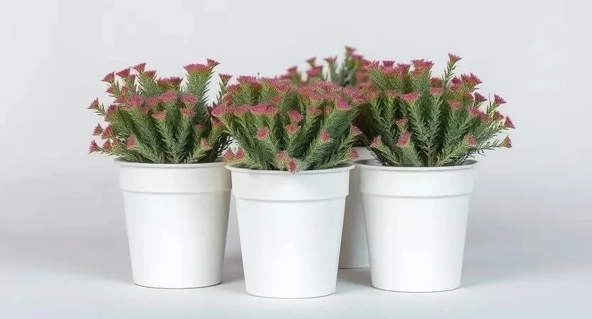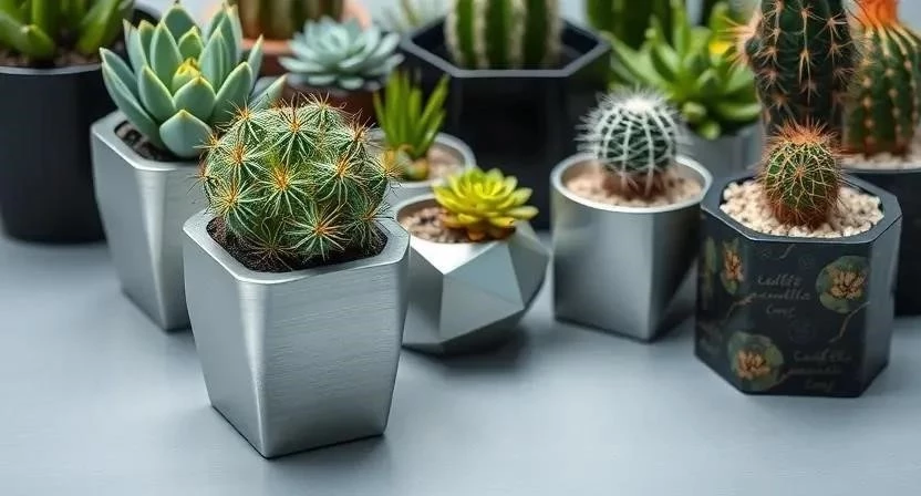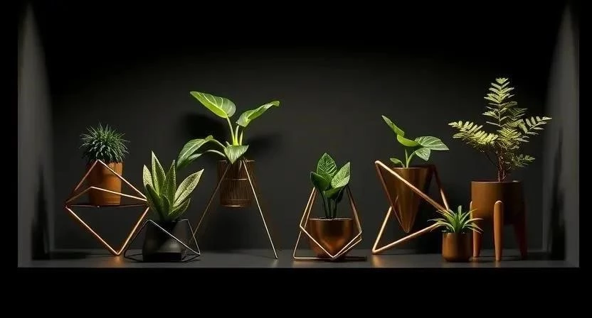 Ответ: Металлические, стеклянные или пластиковые горшки с четкими геометрическими формами.