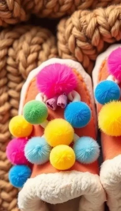 Это одна из самых легких и быстрых идей. Изготовление помпонов из остатков пряжи или ниток займет минимум времени, но добавит тапочкам игривости и объема. Кисточки, сделанные из тех же материалов, также прекрасно дополнят образ. Используйте клеевой пистолет для рукоделия для надежного закрепления этих элементов.