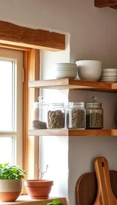На кухне используйте деревянную посуду, керамические горшки для специй и глиняные вазы для цветов. Деревянные разделочные доски и кухонная утварь подчеркнут экологичность пространства. Живые травы в горшках не только украсят интерьер, но и будут полезны в приготовлении пищи.