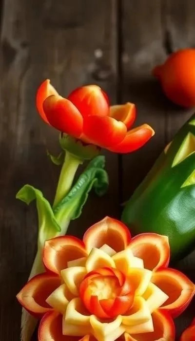 Декор из овощей способен преобразить любое пространство, добавив в него свежесть, оригинальность и праздничное настроение. Для праздничного стола можно создать настоящие шедевры, используя различные техники карвинга. Например, из моркови можно вырезать изящные цветы и листья, которые украсят салат или горячее блюдо. Из огурцов можно сделать корзинки для закусок или оригинальные спирали. Тыква – отличный материал для создания больших скульптур и композиций, которые станут центральным элементом стола.