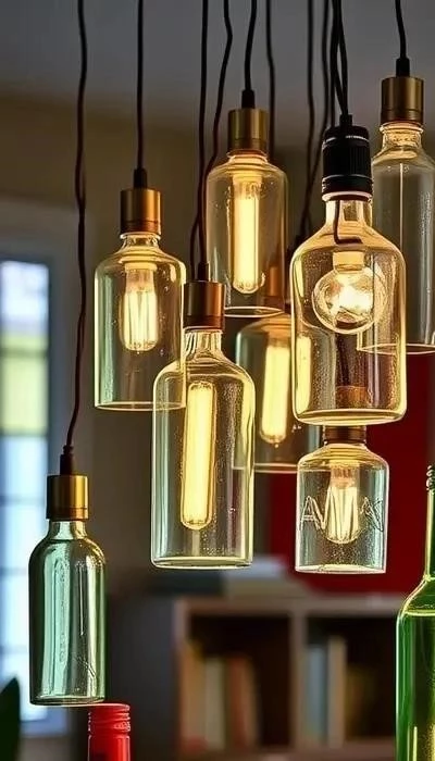 2. Светильники из бутылок/банок: Проделайте отверстие в дне бутылки или банки. Проденьте провод с лампочкой. Украсьте бутылку/банку по своему вкусу. Оригинальный светильник своими руками готов!
