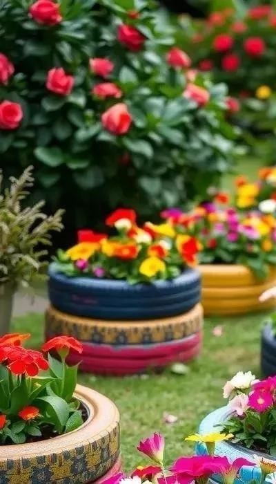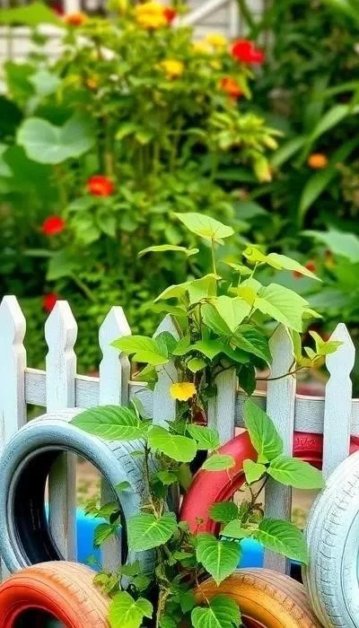 5. Ограждение для клумб: Разрежьте шины на полосы и используйте их для создания декоративного ограждения. Сложность: легкая.