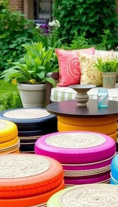 4. Садовая мебель: Соедините несколько шин вместе, создавая столы и стулья. Покрасьте и добавьте мягкие подушки. Сложность: средняя.