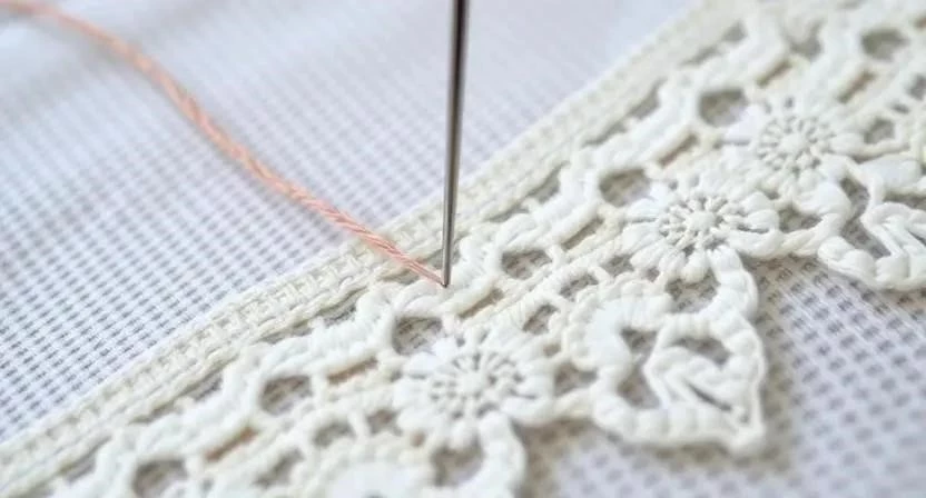 - Шаг 3: Начните пришивать кружево потайным швом. Время: 30-60 минут (в зависимости от длины). Сложность: Средне. Нюанс: Старайтесь захватывать только несколько нитей ткани, чтобы шов был незаметным.