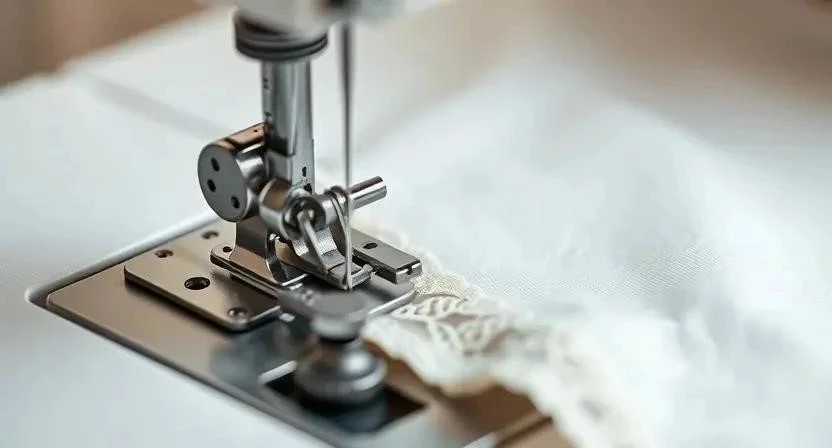 - Шаг 1: Установите на швейную машинку лапку для пришивания кружева (если есть). Время: 5 минут. Сложность: Легко. Нюанс: Если нет специальной лапки, можно использовать обычную лапку.