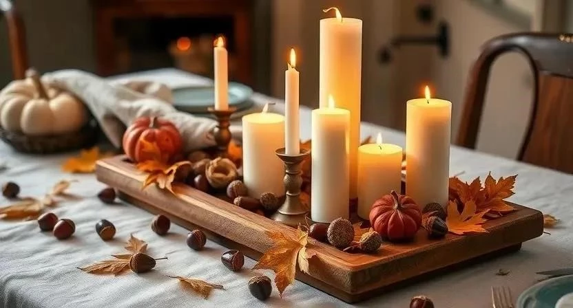 Осенние композиции, салфетки и подставки для тарелок создадут праздничную атмосферу на вашем столе. Для создания осенней композиции вам понадобятся тыквы, листья, ягоды, свечи и ваза. Расставьте тыквы, листья и ягоды в вазе, добавьте свечи и наслаждайтесь красотой осеннего стола.
