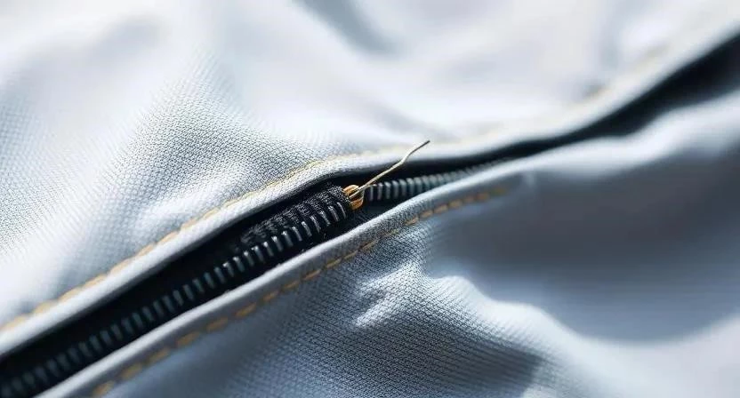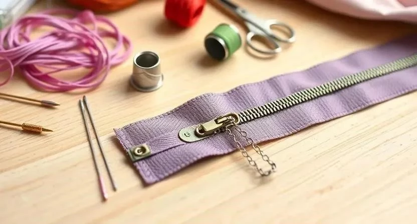 - Шаг 1: Сложите ткань лицевой стороной внутрь и приколите застежку булавками. (Время: 5 минут, Сложность: Легко, Нюанс: Убедитесь, что застежка расположена ровно.)