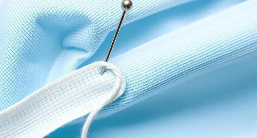 - Шаг 1: Вденьте нитку в иглу и завяжите узелок. Начните шить с изнаночной стороны ткани, захватывая небольшое количество ткани и резинки. (Время: 5 минут, Сложность: Легко, Нюанс: Узелок должен быть надежным, чтобы не распустился)