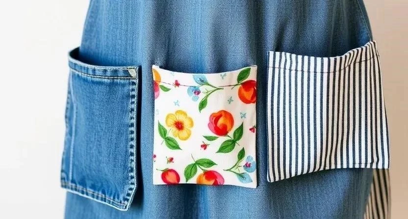 - Пришивание карманов: Приложите карманы к основной части фартука и приколите булавками. Прошейте карманы по периметру, отступив от края на 0.5 см.