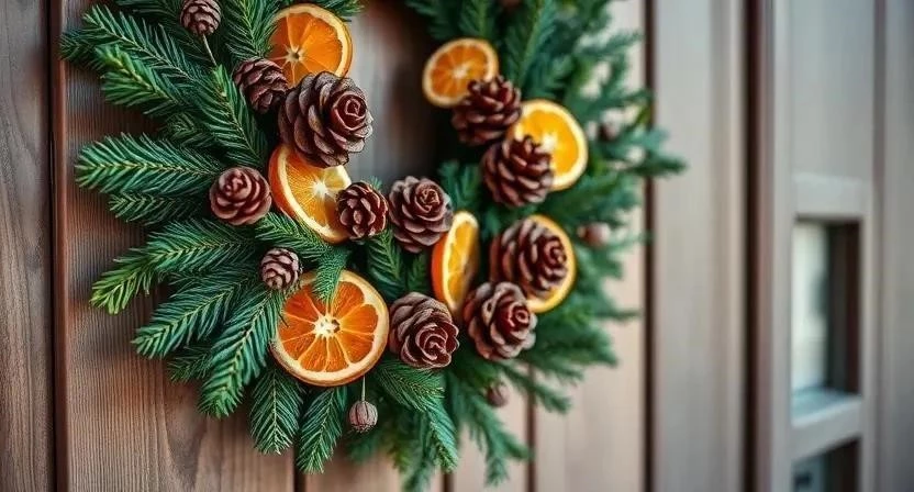 Классическое украшение для двери. Соберите еловые ветки, сформируйте из них круг и закрепите проволокой. Украсьте венок шишками, лентами, игрушками и другими декоративными элементами. Время изготовления: 2-3 часа. Сложность: средняя.