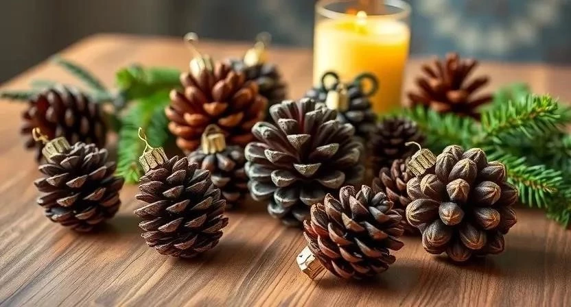 Натуральный и экологичный декор. Соберите шишки, очистите их и покрасьте акриловыми красками. Добавьте блестки, бусины или ленточки. Прикрепите петельку для подвешивания. Время изготовления: 1-2 часа. Сложность: средняя.