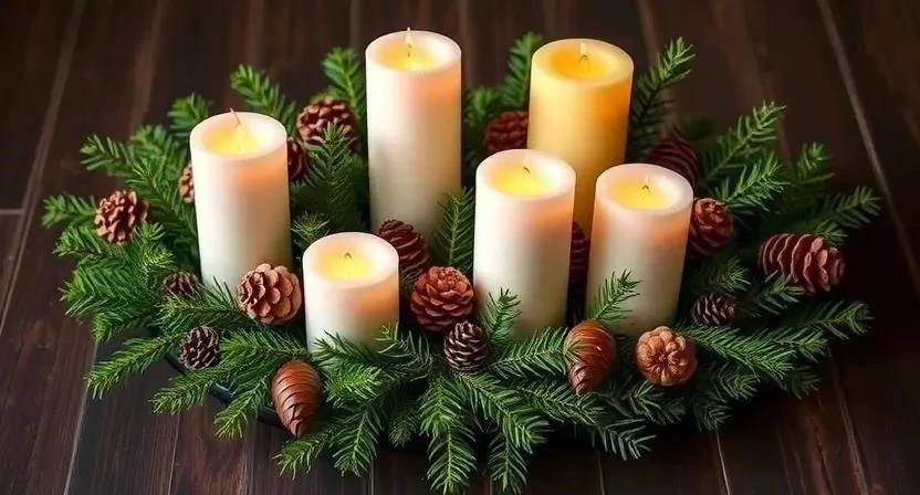 Создайте уютную атмосферу с помощью свечей и еловых веток. Разместите свечи на подносе или блюде, окружите их еловыми ветками и украсьте шишками и игрушками. Время изготовления: 30 минут. Сложность: легкая.