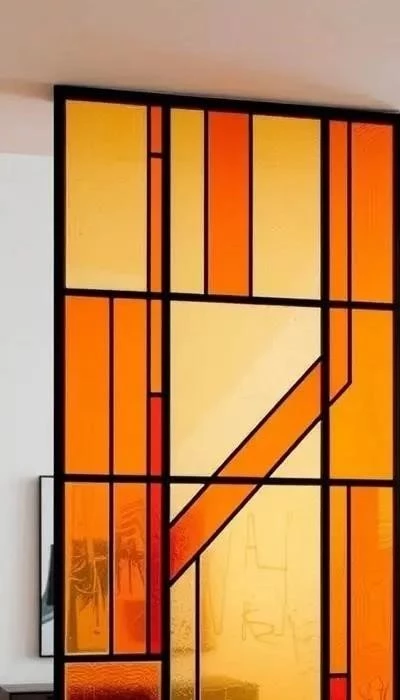 Геометрические узоры: В 2026 году в тренде витражи с четкими геометрическими узорами – от простых линий и фигур до сложных многоугольников и орнаментов. Такие витражи идеально вписываются в современный интерьер и придают ему динамичный и стильный вид.