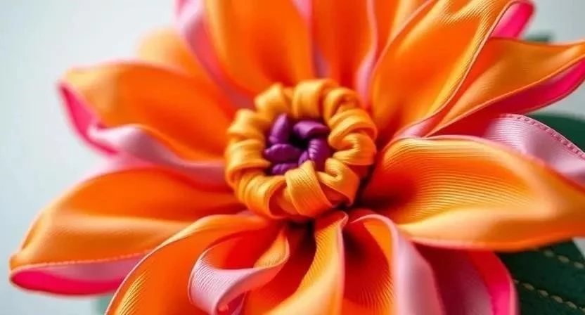 - Шаг 4: Формирование цветка. Продолжайте вязать лепестки, пока не получите желаемый размер цветка. (Время: 15 минут, Сложность: Средне, Нюанс: Можно менять цвет ленты для создания более интересного эффекта).
